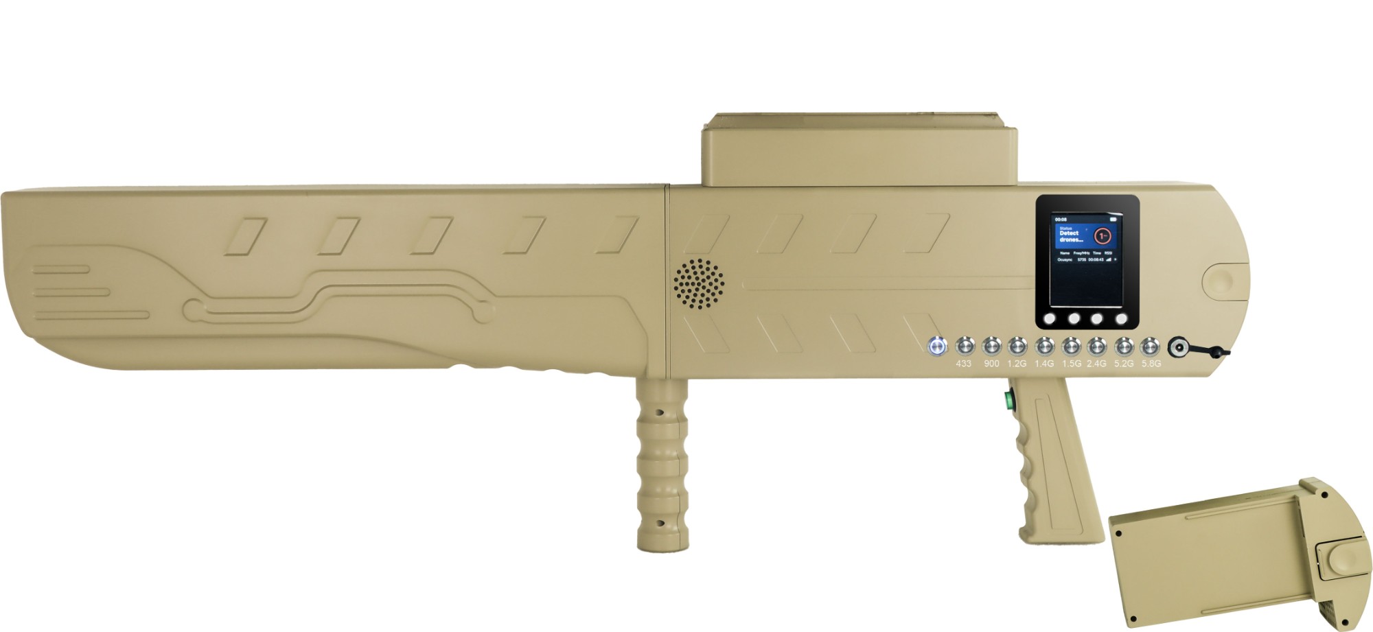 The handheld UAV detection and strike integrated equipment, as a portable UAV detection and strike integrated platform, integrates UAV detection, model identification, rough direction finding, and directional strike. Its principle is based on spectrum sensing and artificial intelligence technology to identify and classify the flight control link and image transmission link of UAV, and can conduct rough direction finding and accurate position acquisition for UAV, and can attack the intruder UAV based on radio interference technology to better guard low altitude safety.